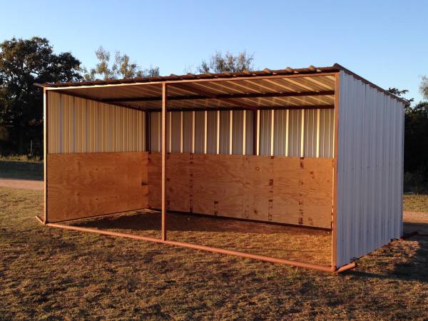 This is a 10' x 12' portable equine / livestock shelter. The skid is built from 2 3/8" drill stem and the frame is 2" square tubing 14 gauge thick. All joints are completely welded. The frame and skid are primer coated. It has 10-year galvalume exterior sheeting. This shed is completely portable, movable from pasture to pasture with a 4-wheeler or small tractor. Shelters come in lengths of 12', 15', 18', 21' and 24'. A 4' kick wall is needed for use with horses, donkeys, or mules. Several options available. The standard 10' x 12' with no options is $2,500 and with kick wall is $3,000. Delivery available. Unable to respond to emails. Please call or text JW for quote