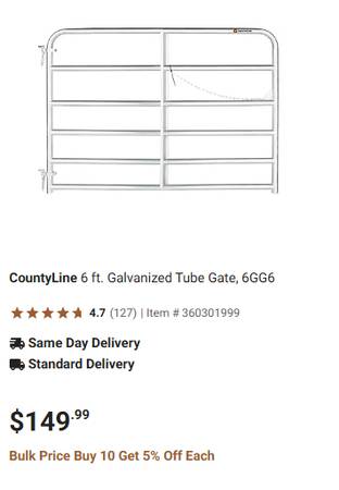 A 6ft. ranch gate currently sells for $149 at Tractor Supply and $167 at McCoys and that does not include sales tax and shipping. I believe my asking price is fair and in line with current price for a new gate.