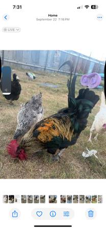 He’s not good with kids at all but is okay with most adults. He can be snappy and moody though. He’s been with us since he was born in May 2023 and he’s a great rooster to his flock. He’s fathered many children and is nice to the hens. We need to get rid of him because our 2 year old is more active now and we don’t want him to attack her. He is a full grown adult with spurs and is a good protector. Hes molting right now and looks kind of goofy but in the spring he is beautiful. Half ayam cemani/half Welsummer.