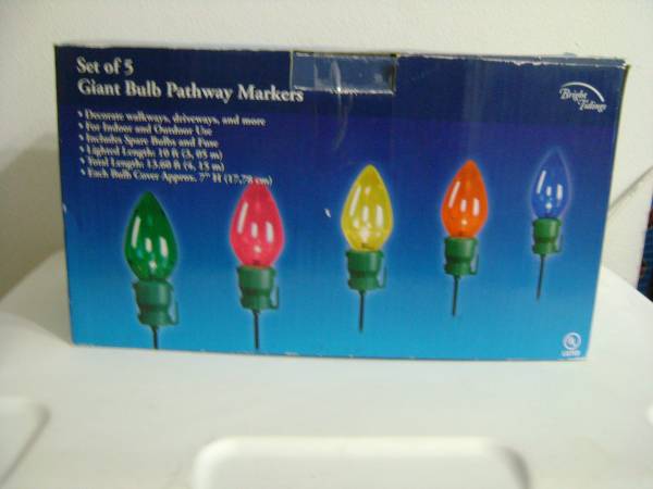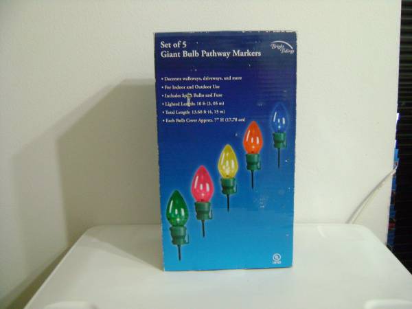 SET OF 5 GIANT BULB PATHWAY MARKERS NEW IN ORIGINAL MANUFACTURER'S PACKAGING. DECORATE WALKWAYS, DRIVEWAYS.FOR INDOOR AND OUTDOOR USE. INCLUDES SPARE BULBS AND FUSE. LIGHTED LENGTH: 10 FEET, TOTAL LENGTH: 13.60 FEET. EACH BULB COVERS APPROX. 7: HIGH.