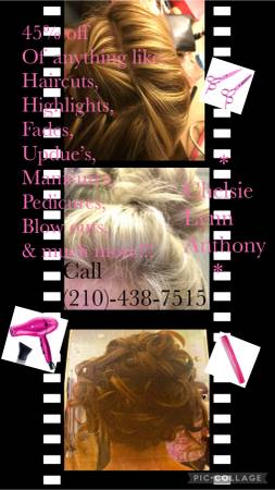 •For example I can do ANY & ALL type’s of Haircut’s/Trim’s for ALL Age’s & for Both Female & Men, All types of diffrent Highlight’s/Lowlight’s, ANY type of Hair Color/Root Touch Up you may want & or need Redone/Different/Want a Change, Men’s/Boy’s Cut’s/Fade’s, ANY Type of Hair Style/Eligant Up Due you may want done for a Special Event/Celebration/Wedding/Ect., Braid’s, Any type of Makeup, Manicure’s/Pedicure’s, Relaxing Facial’s, Really Nice Beautiful Hair Blow Out’s/Hair Style’s, Pretty Curls/Flat Ironing, Perm’s/Ect., and or *ANYTHING* You may want to get done/change I Can Do!! ;)