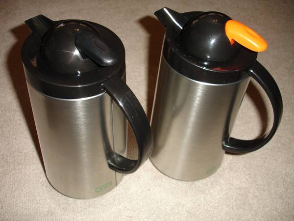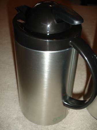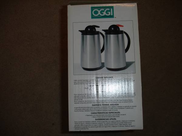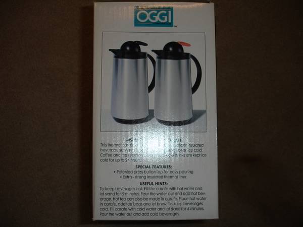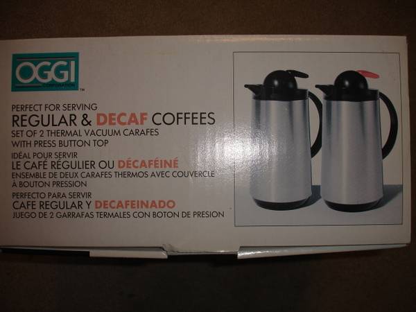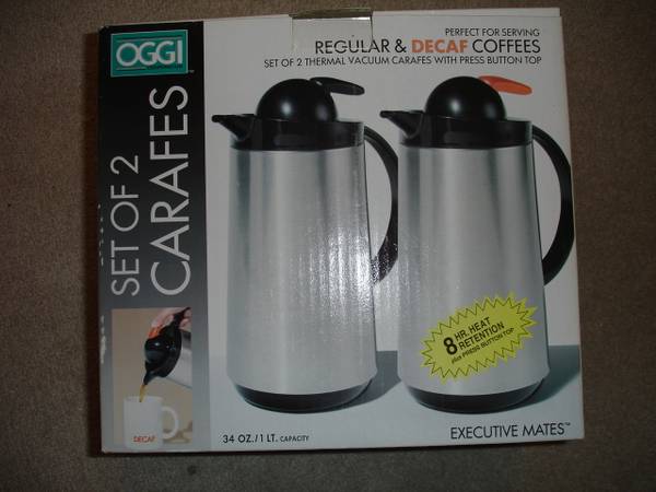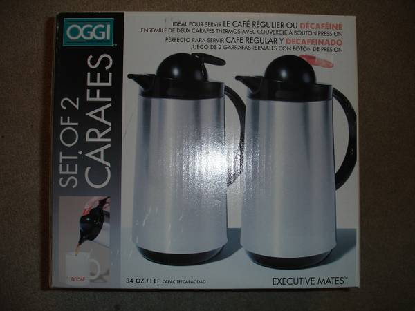 Up for sale is a great used OGGI Set of 2 (1 LT) Thermal Vacuum Carafes With Press Button Top. They come in an original box. These are perfect for Regular & Decaf Coffees. Each carafe has 8 hour heat retention with press button top. Items are used and in good working condition and was rarely used in my house, so I decide to put it up for sale. Used very little for a brief time. Please view all the photos to verify its condition and appearance. Photos are of the actual item that you will receive.