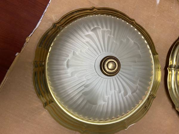 Set of two brass and frosted glass ceiling light fixtures. Good used light fixtures, have some rust in them. 2 for $25.