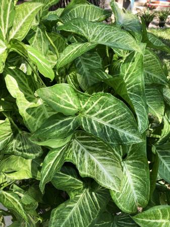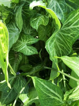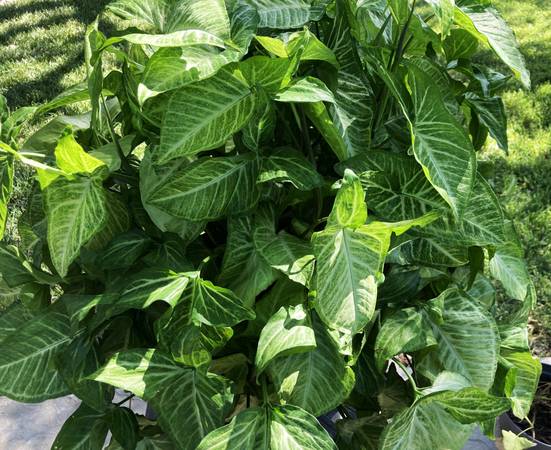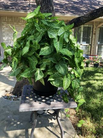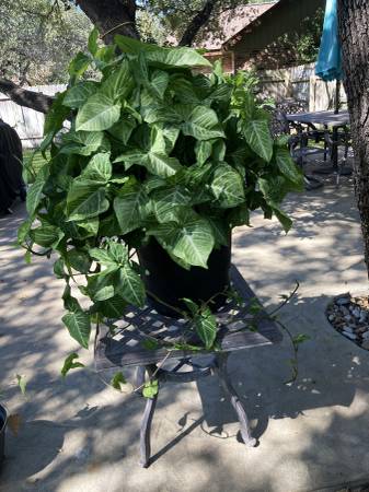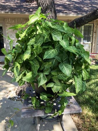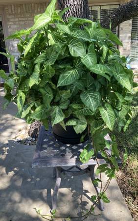 $70. moving, not able to take with. Has grown since this photo was taken. Very healthy large 'arrowhead' plant 38" x 38" from top of pot. Lots of new growth and vines, Very easy to grow. Indoor/outdoor. Matte black self draining sturdy thick walled planter, detachable saucer, 12"tall x 10"across. Just looking for a new bigger home for 'Ms. Syngonium'.