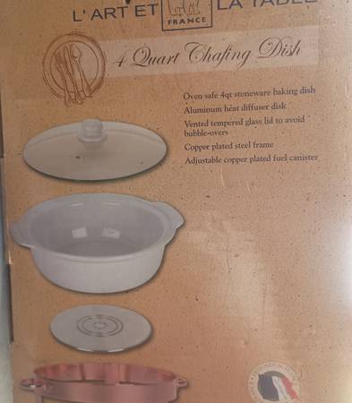 I have a beautiful brand new in box 4qrt chafing dishes which I'm asking just $40/ each or both for $65,if interested you can contact me at 210 331 4two10