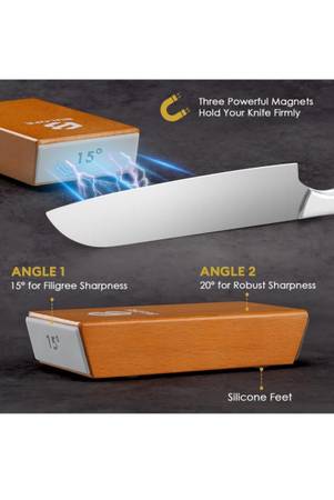 【15° & 20° Magnetic Angles】Maintaining a stable grinding angle is crucial in protecting your knives always as new. 15° for finer sharpness requirements can give your blades made of damascus steel or high-quality steel a fine edge. 20 ° for robust blades like kitchen knives, outdoor knives, and pocket knivies.Combining two angles can maximize the sharpening effect.