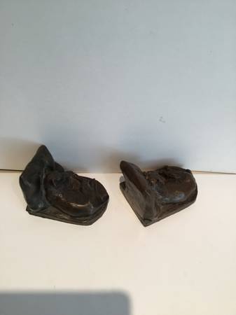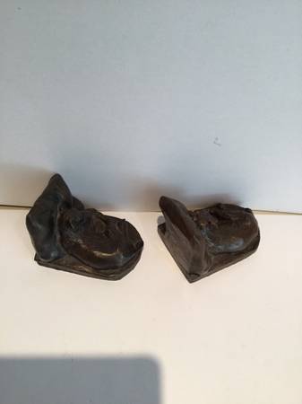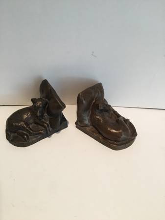 This set of bookends is of old but in like new condition, made in England and bears a reclining dog motif. Detailed in design, brown in color and bronze made, each measures 4”W x 3”H. Not designed to hold large books, this pair works perfectly for smaller items like DVDs, CDs, note pads, correspondence, small books, canine paraphernalia, etc. Decidedly attractive for all animal lovers. A neat vintage gift item, too. Local Pickup. Cash and Carry Only.