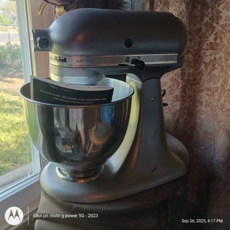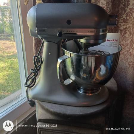 KITCHEN AID mixer/ only been used 2x. Has attachments (the instructions says pouring shield, but it did not come with one. I have another and it did not come with a pouring shield). Silver in color.