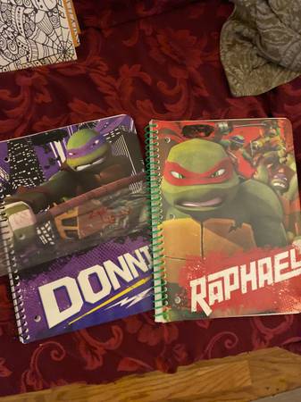 2 Ninja Turtles Spiral notebooks, Wide rule. I have other school supplies: spiral, composition notebooks, filler paper, index cards, pens, pencils, scissors, etc if interested