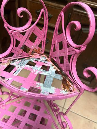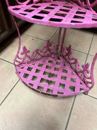 Decorative pink metal corner shelf with three tiers. Please be worn some rest on the shelf. Delivery available for a small fee, depending on location. Located near Bitters and 281 Width 11 inches...
