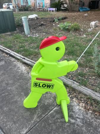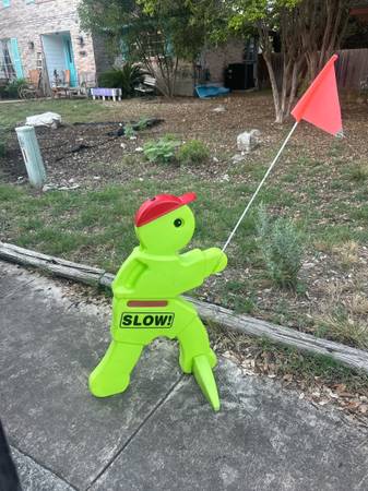 Bright green slow sign with red cap and flag. Delivery available for a small fee, depending on location. Located near Bitters and 281.