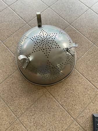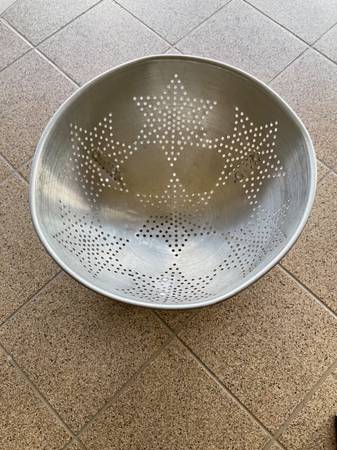 No need to explain what an indispensable kitchen utensil a colander is. This one has a history of its own. A vintage tripodal antique item dating from the 1930s, this heavy duty aluminum star-patterned one was made to last the ages, and so it has. In excellent condition and ready for your various culinary needs, be they as a strainer for pasta, vegetables, spaghetti, etc. Measures 11 1/2” in diameter x 5” Deep x 5 3/4” Tall. A welcome and useful daily cuisine preparation item for all those who love to cook. Bon Appétit. Enjoy! Local Pickup. Cash and Carry Only.