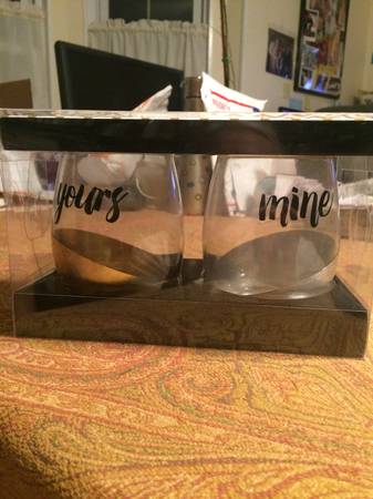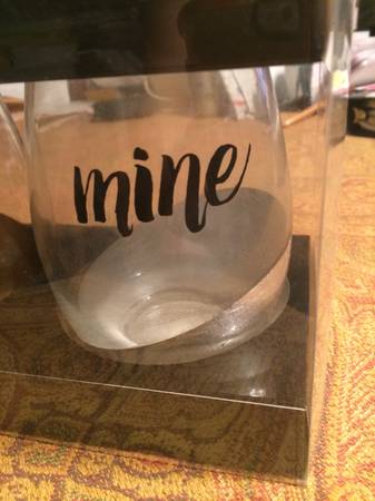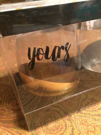 2 Stemless wine glasses, with words: Yours, Mine for you and your significant other :). In original packaging. Asking $20.