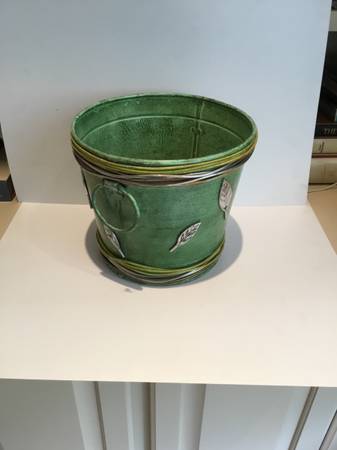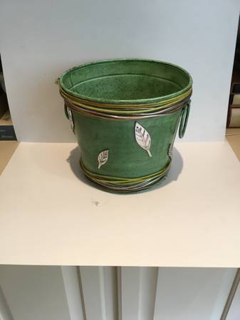ordinarily talented metal craftsmen. Made of heavy aluminum enameled in a wonderful shade of green, this pot is artfully encircled on top and bottom with brass and silver metal strings/ropes. Equipped with two metal handles as well, the pot itself is embellished all over with shiny silver leaves and measures 10” in diameter on top, 8” on its bottom and 9”tall. Although this product is not suitable for water use as it may leak, it works well with a plastic saucer insert to prevent water leakage. Faux plants and/or flowers are no problem and display themselves marvelously. Local Pickup. Cash and Carry Only.