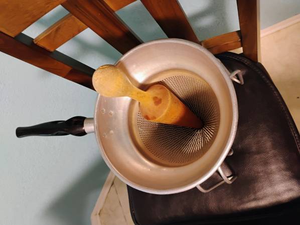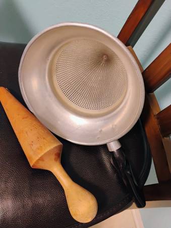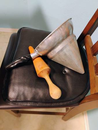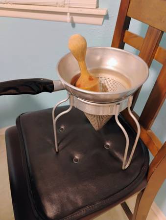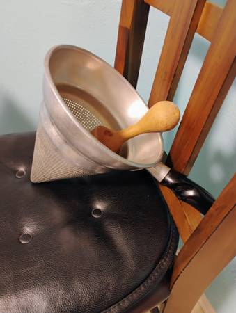 Selling a vintage aluminum cone strainer with wood pestle. Cone & stand measures 9.5 inches tall x 8 inches round on top. Wood pestle measures 11.5 inches long. In great condition. MPU call/text