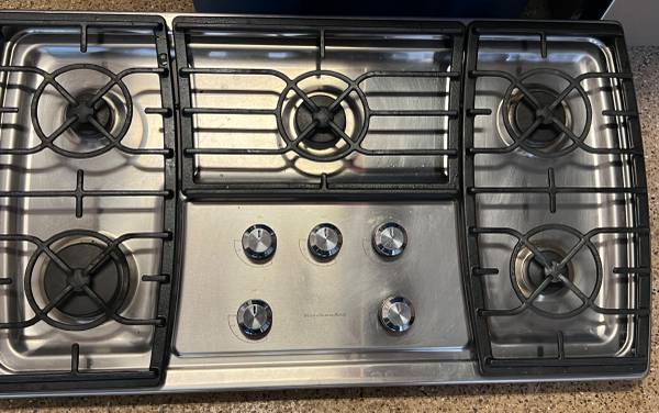Whirlpool KitchenAid Gas Cooktop in Stainless Steel w/ Cast-Iron Grates 5 burners Great condition I am used to induction cooking, so replaced this cooktop with induction. No problems. FCFS No holds....