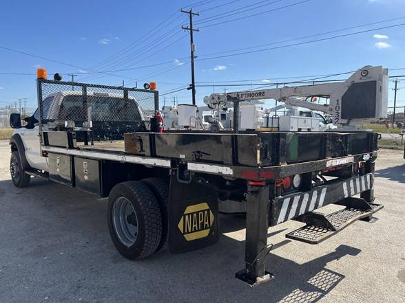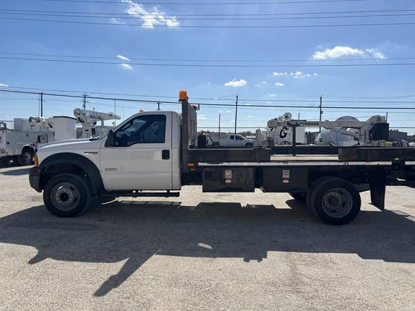 2007 FORD F550 6.0L 3,200 LBS. PTO DRIVEN LIFTMOORE 1032 CRANE. CORNER MOUNTED,, 14FT FLATBED WITH REMOVABLE SIDES AND TWO MECHANICAL OUT AND DOWN OUTRIGGERS. NEW PENDANT REMOTE, TWO NEW FRONT...