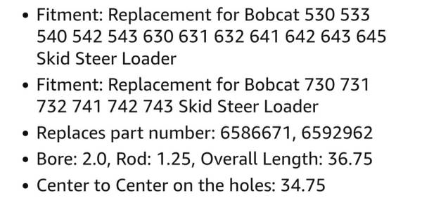 New in box* Retails for $350+* waltyotur Hydraulic Lift Cylinder 6586671 6592962 Replacement for Bobcat Skid Steer Loader Fitment: Replacement for Bobcat 530 533 540 542 543 630 631 632 641 642 643...