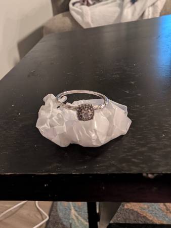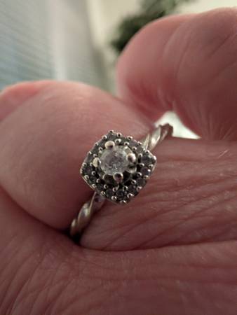 Like new - 14 Karat White Gold Braided Band, Princess Cut 1/4 Karat Diamond, surrounded by many small Diamonds. Size 10 1/2. Can be re-sized. Great Deal! Originally valued at $900. Cash only.