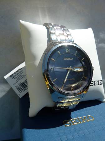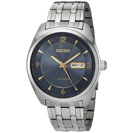Available Seiko Men's Recraft 45mm stainless steel blue dial watch. SNKP01. Round watch with sunray outer dial, guilloche inner dial and gold highlights. Sapphire crystal and a transparent screwed in caseback. Fold over clasp with a push button release. Caliber 7S26. Starting price of $189.