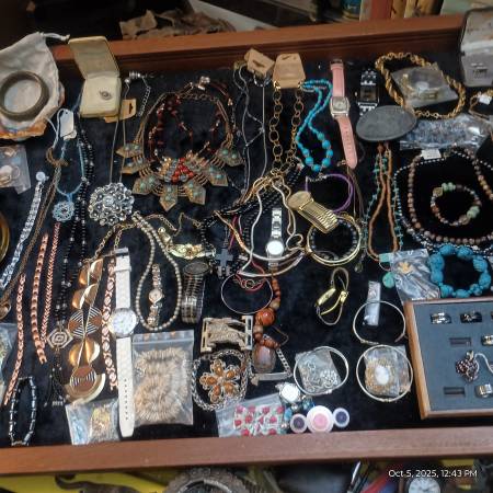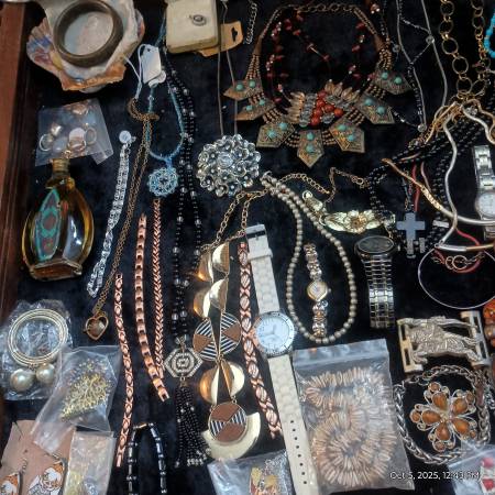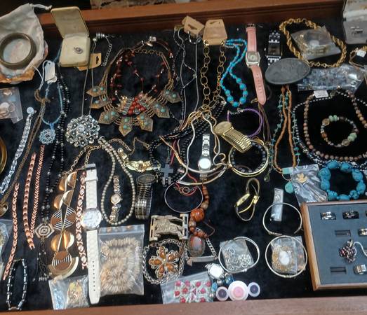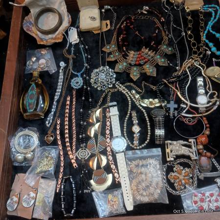 I have a sizable collection of vintage costume jewelry, hand crafted jewelry and watches(all are in working condition unless otherwise noted)most of the pieces are under $10 but about 20% are of notable value I've tried to put price in the photos but am having trouble getting everything marked due to the set up Im using. If any of these pieces are of interest you can contact me at 210 331 4two10 I'm also open to reasonable offers for everything as well -