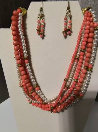 Vintage Faux pearl and orange beaded necklace. Includes earrings for pierced ears. Cash only.
