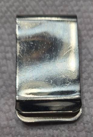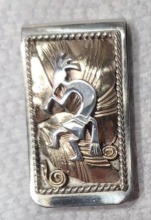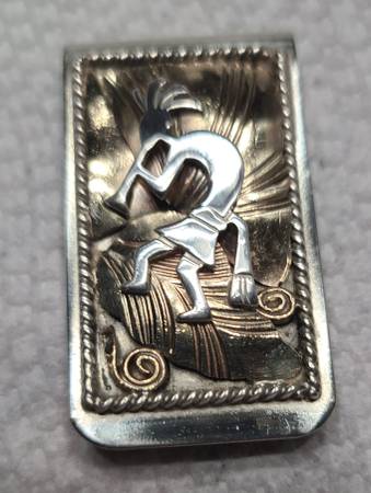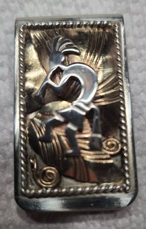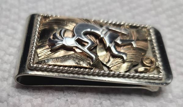 Beautiful Southwest Native American handmade 3-layer Kokopelli money clip. Gold layered leaves on top of base with Kokopelli figure on top. Surrounded by rope rectangle. No markings. 1” x 1 ¾” . 22.4 gm. As much a piece of art and jewelry as it is a money clip. Unknown artist.