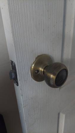 Two-panel round top, interior slab door; smooth hollow core composite door. White painted, pre-bored, interior slab door includes an Andover passage door knob, in brushed brass color. No hinges.