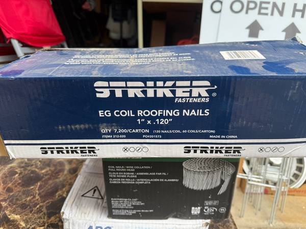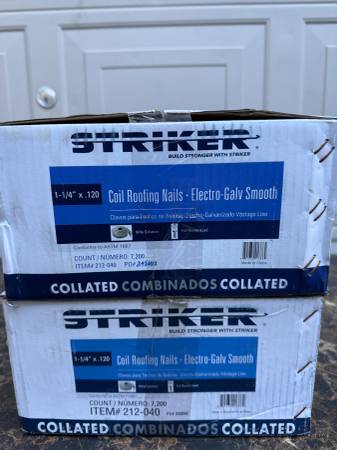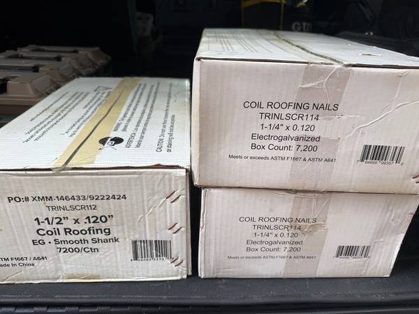 Available in the lot: 📦 COIL ROOFING NAILS (New) Striker 1-1/4" x .120 – 7,200 ct (x2) Striker 1" x .120 – 7,200 ct TRI-BUILT 1-1/4" x .120 – 7,200 ct (x2) TRI-BUILT 1-1/2" x .120 – 7,200 ct Metabo...