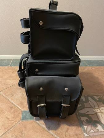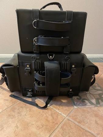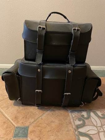 Motorcycle Luggage. All leather. Lightly used in near new/perfect condition. Chrome plated brass buckles. Zip off pouches. Gun pocket. Rain cover. Rain cover. Water resistant. Quick release. Heavy thread. Size/dimensions: Main Bag 16x13x12; Side Bags 10x9x4; Top Bag 14x9x9