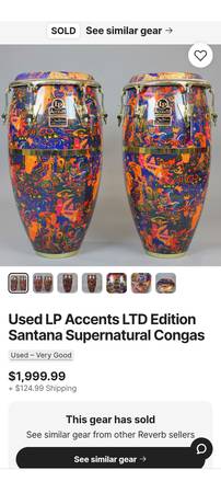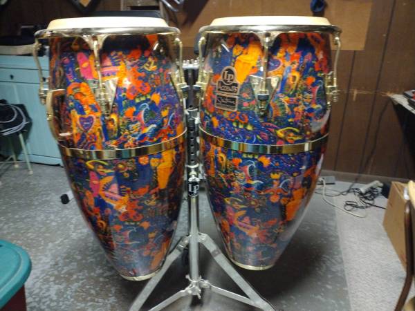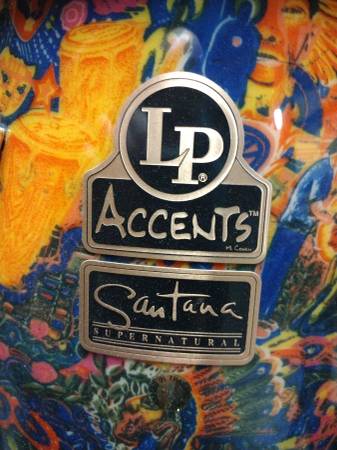 LP Accent Santana Supernatural congos limited edition. Beautiful congos in great shape and would look great on stage. Do not come up for sale very often. Aside from some cosmetic signs of use these drums are in excellent condition and have not been used very often. All parts are original and in perfect working order. this drum is wrapped in graphics from multi-platinum album "Supernatural" and create a look that is definitely Latin American. The congas will be popular with players, fans, and collectors alike. the full-sized fiberglass conga is reinforced with steel rings embedded near the bearing edge to ensure shell integrity. other professional features include Comfort Curve ll Rims, 5/16" tuning lugs, and LP Heart side plates reinforced with backing plates. These are limited edition and don't come up for sale very often. Screenshot photo shows a similar larger pair selling for almost $2000.00.