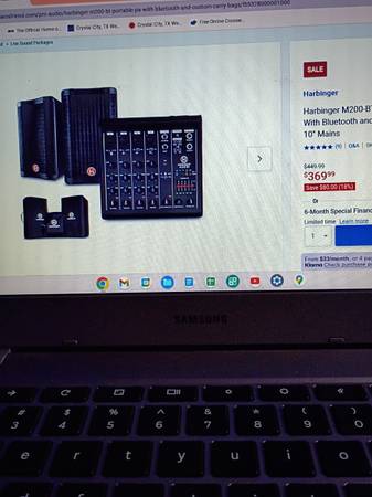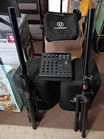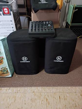 Harbinger sound system. Slightly used. Comes with covers. Great for family gatherings, band practice, etc. Has Bluetooth pairing for phone, laptop, etc. $200 firm - will include free speaker stands....