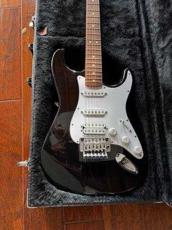 Gorgeous 2000 MIM American Standard Stratocaster with Floyd Rose in beautiful gloss black finish. Here is an AI description of the guitar: A "2000 Fender Stratocaster HSS Floyd Rose" is likely an American Special Series Stratocaster or a similar model from that era, featuring an HSS pickup configuration, a Floyd Rose locking tremolo, and typically a maple neck with a rosewood or maple fingerboard. Specifications include a polyurethane finish, a 9.5" fingerboard radius, and a combination of American single-coil and an Humbucking bridge pickups