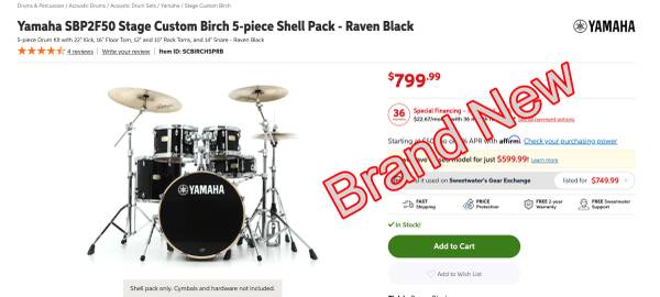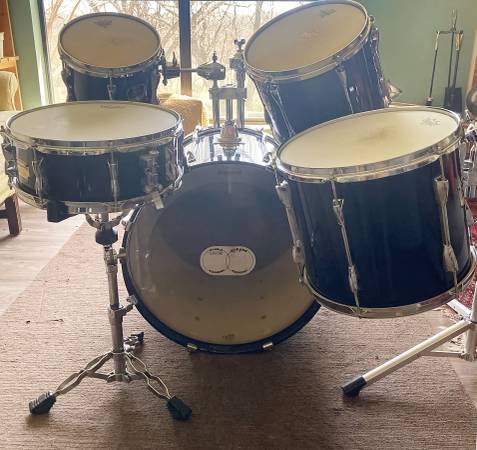 100% Birch Shells are sized 10, 12, 14, 22, with a 5x14” snare. Wraps are tight and clean. A couple of scuffs and blemishes on the Kick Wrap. A solid, punchy kit with a whole lot of life left in it. Under the heads, the shells look brand spanking new. Excellent craftsmanship and condition. The Birch plies give it them a lot of focus and attack, great for studio or live.