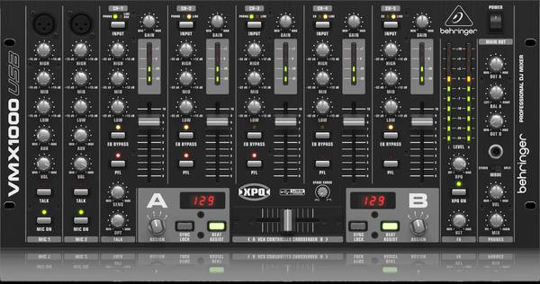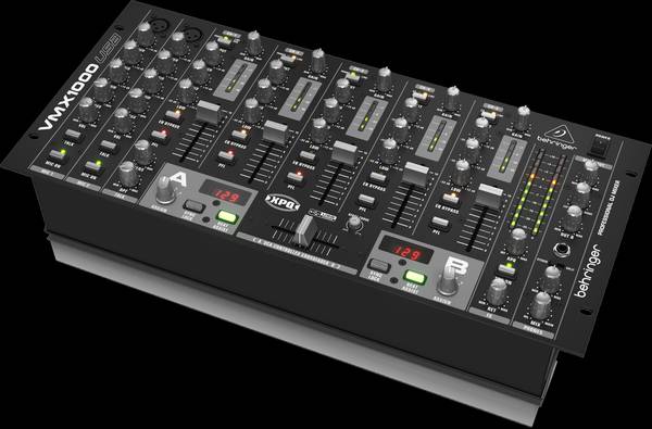 3-band kill EQ (-32 dB) with EQ on/off switch on stereo channels, Gain control and precise level meter per channel