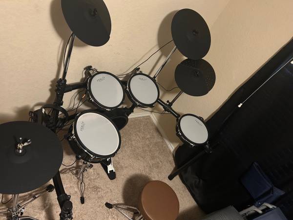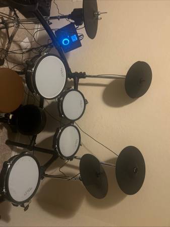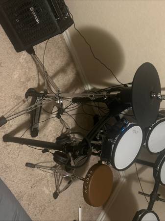 1 crash 2 rides 3 Toms 1 kick plus pedal 1 snare w/ stand 1 hi-hat w/ stand Sound module w/ connections and headphones. 2 sets of drum sticks Drum key to adjust rack. Also includes amp. Pick up only