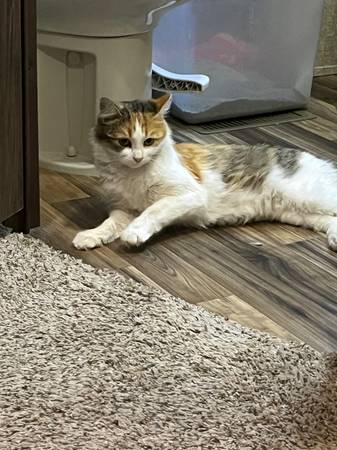 Beautiful calico cat she’s about a year old. I can’t keep due to my health issues. 10.00 rehoming fee comes with litter box.