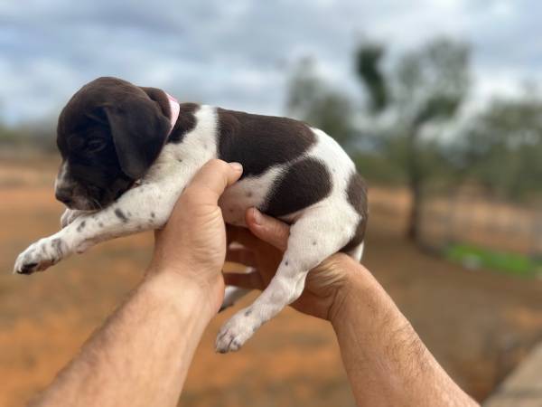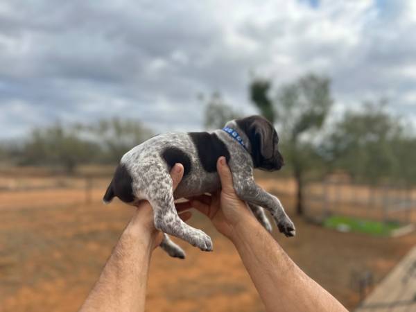 Purebred GSP puppies born on 10/25/25. We have 5 males and 3 females available. All have been dewormed, tails docked and dewclaws removed. Not registering the litter. They will be ready for new homes on 12/20/25. Small rehoming fee applies. Text me the collar color you are interested in.