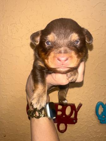 Half tiny toy Aussie Half mini aussie Will be large toy/small mini size Registered Black tri female -looks like 2 blue eyes Red tri male- blue/green eyes Text for info 8302 00 7. 956