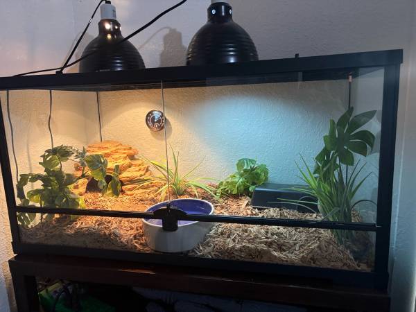 Rehoming baby beaded lizard with its 40 gallon enclosure with everything in it plus hex armor gloves so you can handle him. Text me if your interested