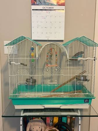 Rehoming due to landlord not allowing any pets $60 firm, comes with cage, perches, and bowls. Pickup only, Dominion area near Rudy’s Nine 56- six 01- 49 twenty three