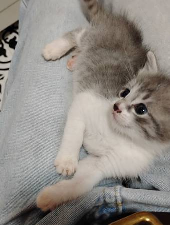 5 wk old female kitten. On soft food and cat litter trained. Very sweet and doesn't cry or whine. Luvs to be cuddled. Rehoming fee $50
