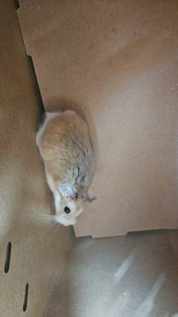 I have a female Roborovski dwarf hamster looking for a new home. She’ll come with her travel cage, hamster ball, and whatever food and bedding we have left for her. The travel cage includes a water bottle, food tray, exercise wheel, and a little hideout house.
