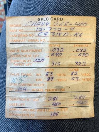 36” ladder bars with cross bar and bracket and bolts $80 SBC 327 std-std crankshaft $50, several sets of 3947041 SBC castings,rare 2 year only with accessory bolt holes1969-1970 $100 a pair, SBC Edelbrock torquer intake manifold $80, SBC billet solid roller cam $150, 2 pair of wheelie bars 48”x 20” & 42” x 20” $100 each, Dixie Powerglide dragster shifter with 8’-10’ cable $350, B&M Powerglide racing shifter with 5-7’ cable $150, B&M Powerglide, turbo 350-400 transmission dragster flywheel shield $50, B&M racing Powerglide shifter with 4’-5’ cable $150