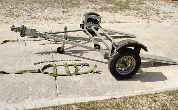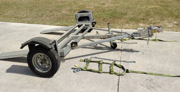 EZE-TOW / Acme tow dolly (https://cartowdolly.com). Bought this brand new in 2024 and used it once for a 5000 mile trip. Galvanized model with surge brakes. I don't have a spare tire and rim - but have 2 brand new tires (unmounted). I added a crank up wheel to help maneuver. Whole thing worked great for the time we used it...