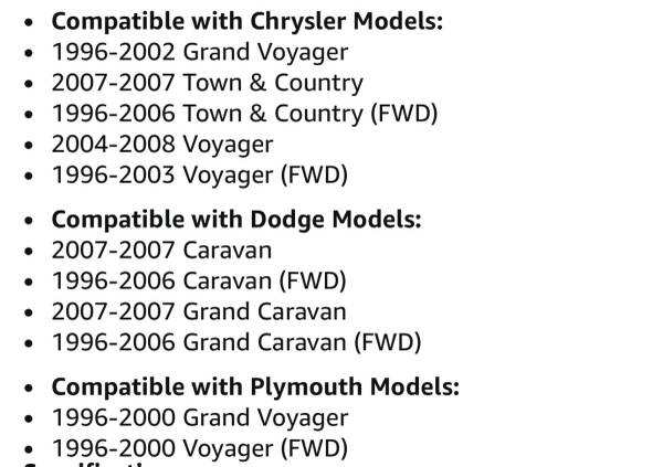 CV axle shaft assembly for 1996-2008 Chrysler Grand Voyager, Town and Country Dodge Grand Caravan and Plymouth Voyager For front left driver side 2.4L, 3.0L, 3.3L, 3.8L See pic for all other...
