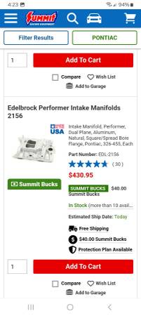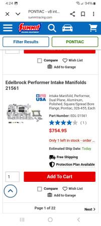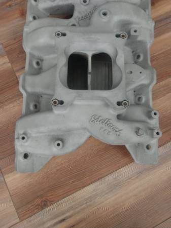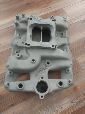 Sand blasted and ready to bolt on Pontiac Edelbrock 4bbl intake manifold with Mr. Gasket aluminum spacer which can be unbolted if you don't want to keep it on there. Part number on this intake is P4B and I don't believe Edelbrock even makes it anymore. Similar new ones range from $450-700+ but I'm only asking $325 for this one. Should fit 326, 350, 389, 400 421, 428 and 455 Pontiac V8 engines. No cracks, repairs or damage to this. Cash in person only and will not ship. Located near Lackland Air Force base in San Antonio. Can meet up near me.