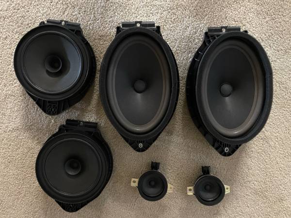 Complete set of speakers. Only used 4 months. I’ll send you more pictures if you want. The 4 larger speakers were made in china. The tweeters were made in Malaysia.