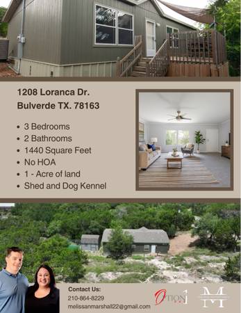 NOW OFFERING a 1% credit that can be used for closing costs or right by down if you go through our preferred lender, the Sigman team at Legacy mutual. Three bedroom two bathroom on one acre. No HOA,” “Comal ISD,” and “Hill Country privacy! 2018 mobile home with new flooring.