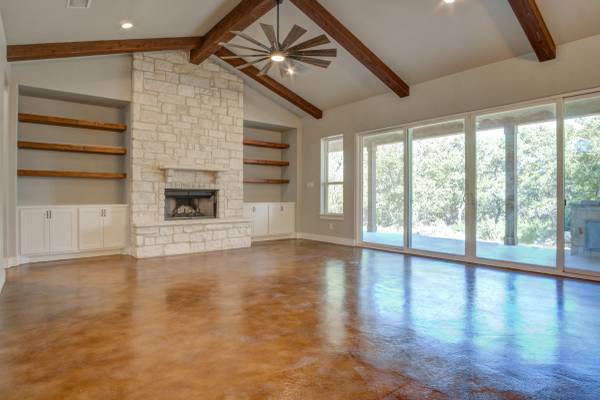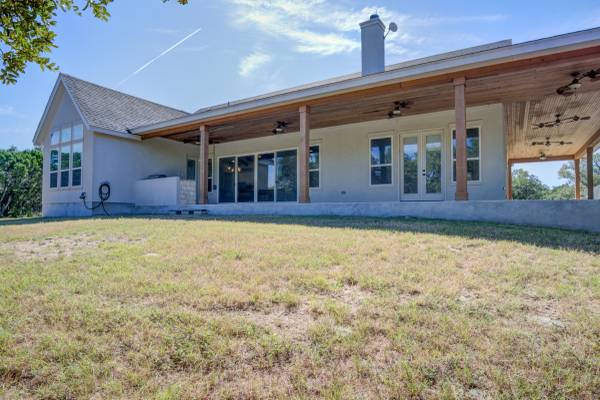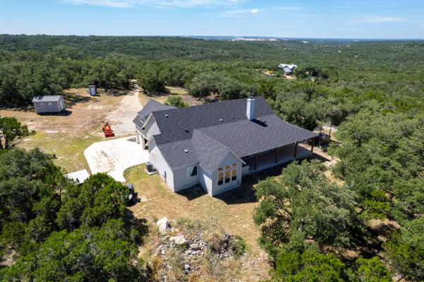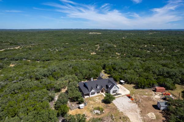 Escape to your private 27-acre Texas paradise, where vast skies, serene luxury, and breathtaking views create an unrivaled sanctuary. Nestled on a scenic ridge, this custom-built 2021 home blends elegance, comfort, and seclusion, all just minutes from town.Step onto the expansive covered porch wrapping around the back, perfect for savoring morning coffee, vibrant sunsets, or the tranquil Hill Country landscape. Inside, the heart of the home is a warm, spacious Great Room with surround sound and a cozy wood/gas fireplace, ideal for gatherings or quiet evenings. The Great Room features oversized sliding glass doors that seamlessly connect indoor and outdoor living. The gourmet kitchen showcases custom cabinetry with hidden spice racks, stainless steel appliances, a gas stove, a coffee bar with filtered water, and a walk-in pantry with a deep freezer recess for effortless functionality.The private primary bedroom offers a peaceful retreat with direct porch access and a spa-inspired bathroom featuring a double vanity, garden tub, bidet, and dedicated water heater for ultimate comfort. Two additional bedrooms, located on the opposite side of the home, share a Jack-and-Jill bathroom and each open to the porch via elegant French doors, ensuring privacy and abundant natural light. A convenient powder room downstairs adds to the home's thoughtful design, totaling 3 bedrooms and 2.5 bathrooms on the main level. Upstairs, a spacious flex room with a full bath serves as a versatile space for entertainment, hobbies, or guest accommodations.The mudroom, off the three-car garage, provides a practical drop zone for coats, boots, and gear. Outside, enjoy a fully equipped outdoor kitchen with sink, grill, and fridge; irrigated garden beds; fruit trees (apple, pear, peach, plum); and ample space to explore. Chickens, wild turkeys, deer, and white-tailed hawks add to the daily charm of this idyllic retreat.Modern upgrades enhance the lifestyle: 2 RV hookups (30-amp), deep water well (450 ft deep), aerobic septic system with quarterly maintenance, 2 tankless water heaters, spray foam insulation, whole-house water softener and filtration, south Texas Internet with Wi-Fi extender, cell phone booster, Dish Network, two storage sheds (12x16 with guest house potential, 8x8), deer blinds (convey), and 10-foot interior doors for an open, airy feel.More than a home, this is a lifestyle crafted with heart and intention. Experience the peaceful rhythm of the Hill Country living in your own slice of paradise. Call/Text show contact info